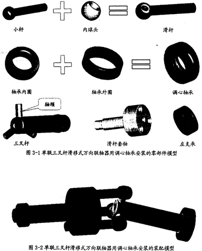 三叉桿滑移式萬(wàn)向聯(lián)軸器由滑桿套軸(又稱為輸入軸)、三叉桿(又稱為輸出軸)、小桿和內(nèi)球頭等組成產(chǎn)(這幾個(gè)構(gòu)件的模型圖3-1所示),其中小桿和內(nèi)球頭裝配成滑桿(模型的裝配關(guān)系如圖3-l最上部),在這種連接形式下,內(nèi)球頭可在小桿內(nèi)轉(zhuǎn)動(dòng),即形成球面副,具有三個(gè)轉(zhuǎn)動(dòng)自由度。在滑桿套軸上有三個(gè)均勻分布的孔(小桿的滑道),與安裝在三叉桿軸頸上的滑桿相配合,這里所有的配合均為間隙配合。當(dāng)三叉桿萬(wàn)向聯(lián)軸器運(yùn)轉(zhuǎn)時(shí)(兩軸有夾角),滑桿一方面沿滑道的中心線移動(dòng),另一方面沿三叉桿軸頸移動(dòng),從而實(shí)現(xiàn)運(yùn)動(dòng)過(guò)程中的角度補(bǔ)償。