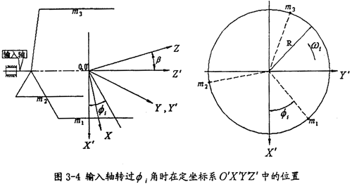 i時(shí),在坐標(biāo)系O′X′Y′Z′中位置如圖3-4所示(圖3-4中右圖為左視圖,wi為輸入轉(zhuǎn)速),這樣建立坐標(biāo)系后,就可以利用引入齊次坐標(biāo)的方向余弦矩陣——四階變換矩陣進(jìn)行運(yùn)動(dòng)方面的分析了。