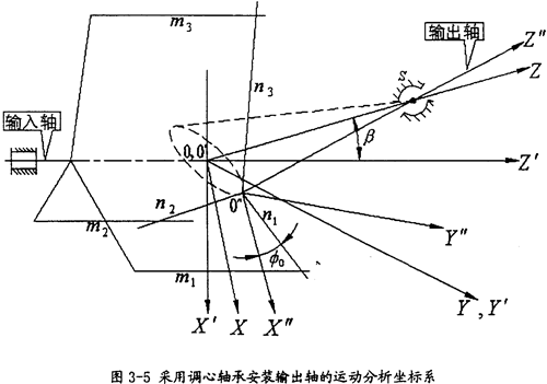 由于輸出軸作一圓錐運(yùn)動(dòng),在分析的過(guò)程中需建立三套坐標(biāo)系,如圖3-5所示。