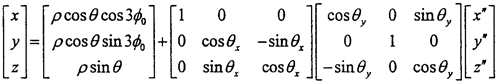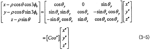 由于動(dòng)坐標(biāo)系O″X(qián)″Y″Z″的O″Y″軸取得始終垂直于固定坐標(biāo)系OX軸,可認(rèn)為先把OXYZ坐標(biāo)系繞OX軸轉(zhuǎn)過(guò)夾角θx,使OY軸與O″Y″軸平行,再繞新的OY軸轉(zhuǎn)過(guò)θy,使OX軸與O″X(qián)″軸平行,OZ軸也同時(shí)平行于O″Z″軸(變換空間位置如圖3-6所示)。則固定坐標(biāo)OXYZ與動(dòng)坐標(biāo)系間的變換關(guān)系如下: