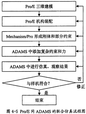 在仿真中如果發(fā)現(xiàn)結果不對,則我們需要對前面的模型進行修正,然后再做仿真分析,直到結果正確?偠灾肞ro/E和ADAMS進行聯(lián)合仿真,其基本的步驟如圖4-5所示。