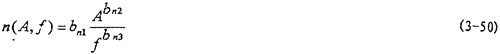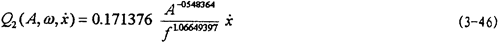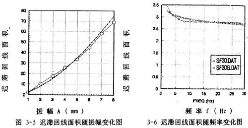 對于(3-22)模型,我們用阻尼耗能的能量關系來辨識阻尼力與振幅和頻率的關系。在前面,遲滯回線面積(即阻尼耗能)與振幅的函數(shù)關系已建立起來,見(3-38)式,而且式中參數(shù)也已辨識出。同樣,用數(shù)值積分,可以算出振幅一定,頻率變化時遲滯回線的面積,由此得出遲滯回線面積與頻率的對應關系,將這些對應關系畫成曲線如圖3-6中大圓點曲線所示。由遲滯回線面積隨頻率變化的規(guī)律分析,可建立其函數(shù)關系為: