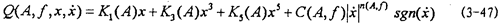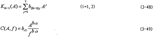 的函數(shù),或者說恢復力Q是剛度函數(shù)K1(A),K3(A),K5(A)和阻尼函數(shù)C(A,f)以及阻尼成分函數(shù)n(A,f)的函數(shù),其中阻尼成分函數(shù)n(A,f)描述阻尼的組成情況,n(A,f)=0時,阻尼為干摩擦阻尼,n(A,f)=1時,為粘性阻尼,0<n(A,f)<1時,阻尼由粘性阻尼和干摩擦阻尼組成,n(A,f)>1時,阻尼成為“高階”阻尼。對于(3-47)式,當振幅與頻率一定時,式中的Kl(A),K3(A),K5(A)和n(A,f)均為定數(shù),當振幅A和頻率變化時,它們均是函數(shù),因此參數(shù)辨識實質上是參數(shù)函數(shù)的辨識。首先我們用非線性參數(shù)辨識方法Marquardt法,根據(jù)試驗所得的數(shù)據(jù),按照(3-47)式對每一遲滯回線進行參數(shù)辨識,可以得到對應的K1(A),K3(A),K5(A),C(A,f)和n(A,f)值,對每種工況下的數(shù)據(jù)隨振幅和頻率變化趨勢進行分析后,可以建立剛度函數(shù)、阻尼函數(shù)和阻尼成份函數(shù)的數(shù)學表達式為: