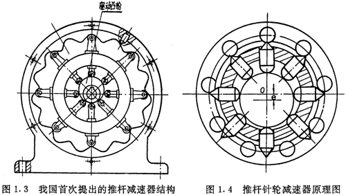 推桿減速器雖然和其它活齒傳動機(jī)構(gòu)在原理上基本相同,但由于采用獨特的推桿作為活齒構(gòu)件,所以機(jī)構(gòu)本身有它的特殊性。并且經(jīng)歷了若干次結(jié)構(gòu)上的更新,才發(fā)展成為目前這種已形成工業(yè)生產(chǎn)能力的結(jié)構(gòu)形式。