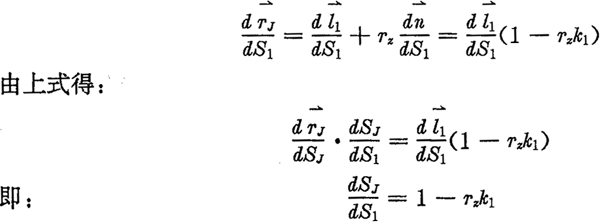下面再推導(dǎo)一下齒廓及其法向等距線的相對(duì)曲率關(guān)系。設(shè)HJ的孤長參數(shù)為SJ,相對(duì)曲率為kJ,而H1的孤長參數(shù)為S1,相對(duì)曲率為k1,由微分幾何可得: