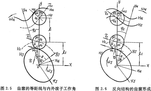 外滾子中心O2的軌跡H2是內(nèi)齒圈齒廓的內(nèi)法向等距線,它可以看作是一條以φ2為參數(shù)按順時(shí)針方向形成的有向曲線(對(duì)圖2.6所示反向結(jié)構(gòu),H2是一條按逆時(shí)針方向形成的有向曲線H2的方程為: