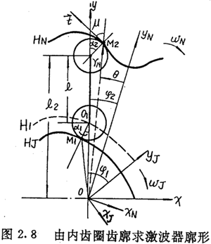 設(shè)選定內(nèi)齒圈齒廓HN的方程為TN=TN(θ),θ 增加的方向為逆時針方向,當(dāng)內(nèi)齒圈N相對傳動圈轉(zhuǎn)過角度φ2時,對應(yīng)于激波器相對傳動圈轉(zhuǎn)過的角度為φ1,如圖2.8所示。設(shè)此時HN與外滾子在M2點接觸,同樣由微分幾何,內(nèi)齒圈齒廓曲