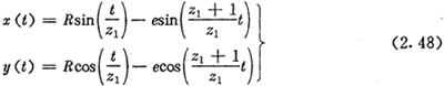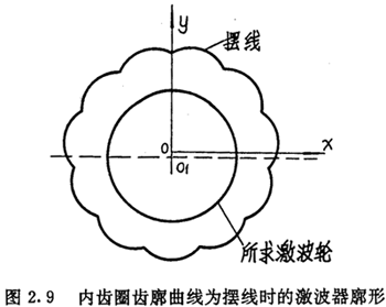 由上面可以看出,在選定激波器廓形TJ=TJ(θ)的情況下,正反兩種結(jié)構(gòu)所得到的內(nèi)齒圈齒廓方程式(2.21)與式(2.22)在形式上是不同的。對于反向結(jié)構(gòu),用-θ代換激波器方程中的θ,即令TJ=TJ(-θ),則θ增加的方向為順時針方向,若激波器廓形可表示為偶函數(shù),即TJ(—θ)=TJ(θ),讓激波器按逆時針方向轉(zhuǎn)動,則所得的內(nèi)齒圈齒廓方程式完全與(2.21)式相同。因而齒廓方程式(2.22)與式(2.21)雖然形式不同,但實質(zhì)是一樣的。區(qū)別在于參數(shù)吸的取值方向,今后以式(2.21)作為內(nèi)齒圈齒廓的標(biāo)準(zhǔn)形式。
