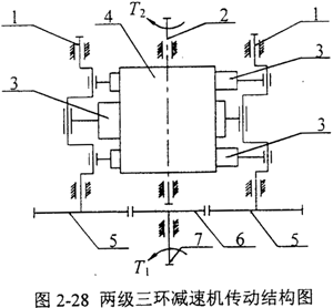 三環(huán)減速機(jī)是為適應(yīng)現(xiàn)代機(jī)械設(shè)備對(duì)傳動(dòng)機(jī)構(gòu)的新要求而開(kāi)發(fā)的一種以漸開(kāi)線少齒差行星齒輪傳動(dòng)原理工作的新型傳動(dòng)裝置,本文所研究的三環(huán)減速機(jī)傳動(dòng)結(jié)構(gòu)如圖2-28所示,它由兩根二級(jí)高速偏心輸入軸1,低速輸出軸2,三片內(nèi)齒環(huán)板(兩塊兩側(cè)環(huán)板3和一塊中間環(huán)板3′)和外齒輪4構(gòu)成。三片內(nèi)齒環(huán)板偏心安裝在兩根高速軸上1上,為了克服二級(jí)偏心輸入軸的死點(diǎn)位置和增大傳動(dòng)比,采用兩個(gè)分流定軸齒輪5分別帶動(dòng)兩個(gè)偏心輸入軸,而齒輪5則由一級(jí)輸入軸7上的主動(dòng)齒輪6帶動(dòng)。三個(gè)內(nèi)齒環(huán)板偏心之間的相位差為π,并且考慮慣性力平衡,中間環(huán)板的厚度取為兩側(cè)環(huán)板厚度的2倍,它們都與外齒輪4相嚙合,外齒輪4安裝在輸出軸2上,各軸均平行配置。