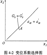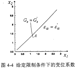 某項限制條件,可以曲線的形式表示在xl,x2坐標(biāo)系內(nèi),若把每個限制條件都以曲線形式繪于x1,x2坐標(biāo)系內(nèi),則它們的交點(diǎn)A便對應(yīng)著這對齒輪的變位系數(shù),如圖4-2所示。