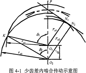 少斷差內(nèi)嚙合傳動是指內(nèi)、外齒輪的齒數(shù)差較少的一種行星傳動形式,它具有傳動比大、體積小、重量輕、加工方便等優(yōu)點(diǎn),日益廣泛地應(yīng)用于國防、礦山、冶金、化工、紡織、起重運(yùn)輸、建筑工程、食品工業(yè)和儀表制造等部門和行業(yè)中。少齒差內(nèi)嚙合傳動示意圖如圖4-1所示。