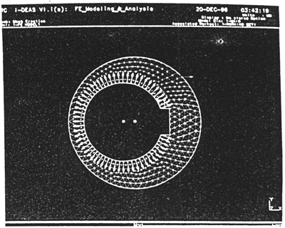用I-DEAS文件將實(shí)體模型傳輸?shù)接邢拊治鲕浖。在此幾何模型的基礎(chǔ)上,對(duì)外圓周以每360°/5一個(gè)節(jié)點(diǎn)進(jìn)行等分,選用平面三角形單元,自動(dòng)生成如4-2所示的有限元網(wǎng)格圖。
