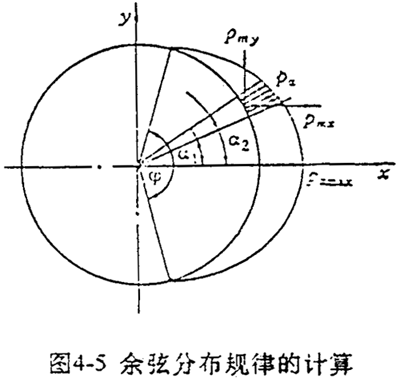 確定作用于結(jié)構(gòu)邊界上的非均布載荷是一件復(fù)雜工作,往往需要進(jìn)行一些較復(fù)雜的計(jì)算,譬如采用接觸問題有限元法進(jìn)行計(jì)算。在實(shí)際應(yīng)用中常采用一些近似的假設(shè)規(guī)律來(lái)代替這些復(fù)雜的未知分布規(guī)律。對(duì)于軸承載荷,一般假設(shè)沿周邊按余弦規(guī)律分布如圖4-5所示,即