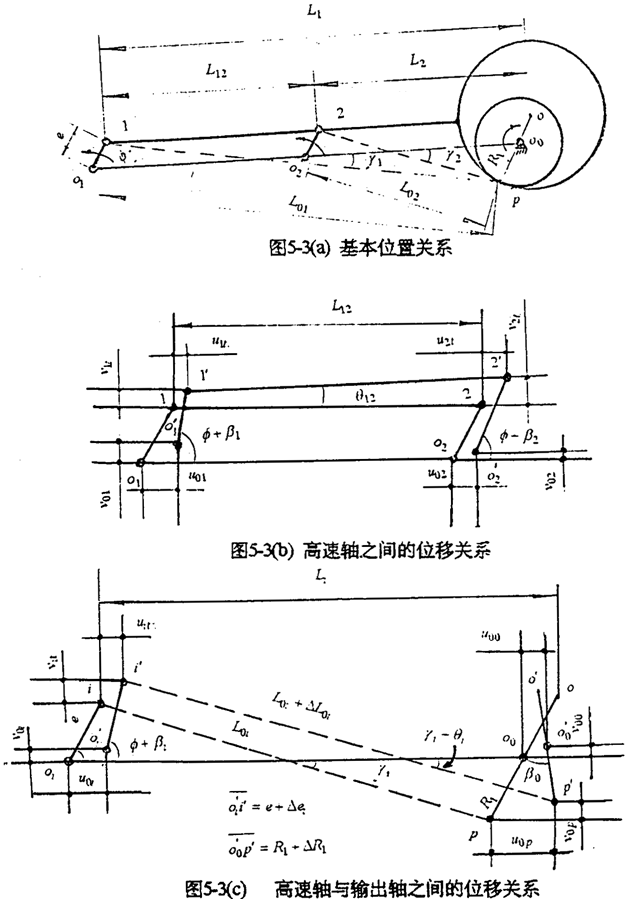 三環(huán)減速是多相并列連桿行星齒輪傳動過約束機(jī)構(gòu)。應(yīng)該從整體系統(tǒng)上去考慮其變形關(guān)系。圖5-3是一相子機(jī)構(gòu)的位移關(guān)系圖。圖5-3(a)是基本位置圖、圖5-3(b)是高速軸之間的位移關(guān)系、圖5-3(c)是高速軸與輸出軸之間的位移關(guān)系(i=1、2)。由圖寫出各運(yùn)動副中心的位移關(guān)系如下: