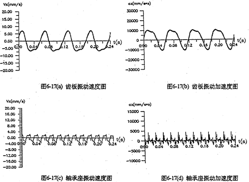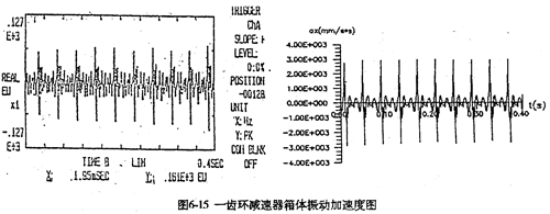 由于每片齒板都存在同樣的周期性激勵(lì)沖擊函數(shù),相位差120°,迭加后的總效果仍然是轉(zhuǎn)頻周期函數(shù)。因此對(duì)箱體軸承座的沖擊也呈周期性。圖6-13是支承軸箱體軸承座的振動(dòng)速度及加速度的實(shí)測(cè)時(shí)域曲線圖。其曲線圖的變化規(guī)律及幅值與圖6-4完全接近。速度及速度沖擊值為v