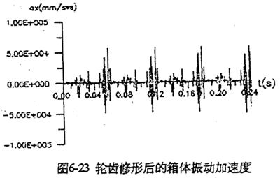 在上一章已經(jīng)分析過(guò),當(dāng)三軸水平布置而且高速軸在輸出軸的同側(cè)時(shí),載荷幅值最大,各相嚙合力等都很不均衡(見(jiàn)圖5-24)。圖6-19是將支承軸布置在輸入軸與輸出軸間的150°位置時(shí)齒板的振動(dòng)加速度。由圖可知,因誤差引起的沖擊已被完全克服,而且原有的穩(wěn)態(tài)幅值也降低了很多。