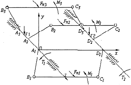 圖3.3是一多相并列雙曲柄機(jī)構(gòu)的結(jié)構(gòu)簡圖,曲柄軸為輸入軸,其上作用有已知外力F1和未知輸入力矩T1,曲柄軸為支撐軸,其上的外力知T2和外力F2以及作用在連桿B1C1上的合外力Fn1,外力矩M1都是已知的,在任一時刻t,連桿A1B1與XOZ平面的夾角為φ1,運用機(jī)構(gòu)靜態(tài)力學(xué)分析方法[22、29、30、34],對連桿B1C1可列出受力平衡方程: