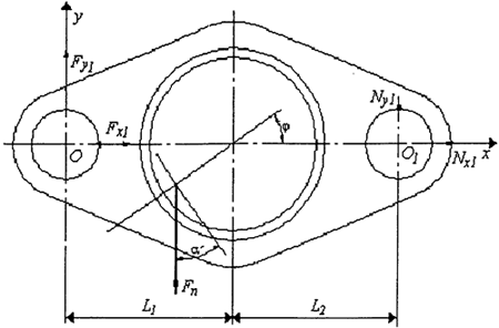 把一個三相并列雙曲柄機(jī)構(gòu)作為一般情況進(jìn)行受力分析,建立相應(yīng)的數(shù)學(xué)模型,然后分四種狀況進(jìn)行計算。圖3.4是基本型(低速軸在中間,高速軸兩側(cè)布置)環(huán)板受力情況,左邊的高速軸為輸入軸,輸入力知M,輸入轉(zhuǎn)速為n,中間帶外擺線輪的為輸出軸,右邊的高速軸為中間軸(支撐軸),在齒板上以左邊軸承孔中心B1為坐標(biāo)原點建立坐標(biāo)系0-XYZ,輸入曲軸A1B1與X軸的夾角為φ。