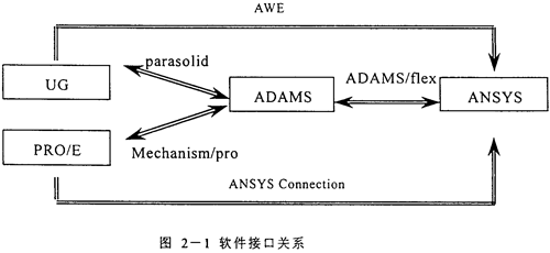 以上四個(gè)軟件均是當(dāng)今比較流行且功能強(qiáng)大的大型CAD/CAE軟件,然而考慮到ADAMS的內(nèi)核就是Parasolid,從UG中導(dǎo)入ADAMS的模型包含了在UG里定義的密度、質(zhì)量等幾何屬性,不需作任何變更就可使用;而PRO/E與ADAMS間通過Mechanism/pro模塊進(jìn)行連接時(shí)存在較多的問題,經(jīng)過長(zhǎng)時(shí)間的摸索才連通,且發(fā)現(xiàn)在PRO/E里南非先將各個(gè)零件定義為剛體,作為子裝配只能定義為一個(gè)剛體,可是像RV減速器這樣的大模型在裝配過程中不可避免地含有子裝配并且子裝配中的零件間有相對(duì)運(yùn)動(dòng),將其定義為一個(gè)剛體是錯(cuò)誤的,為此,本課題中采用了UG、ADAMS與ANSYS形成的分析平臺(tái)。