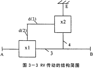 為計(jì)算RV傳動(dòng)的傳動(dòng)比,將上述的傳動(dòng)簡(jiǎn)圖用圖3-3所示的結(jié)構(gòu)簡(jiǎn)圖代替。該機(jī)構(gòu)簡(jiǎn)圖包括兩個(gè)簡(jiǎn)單行星機(jī)構(gòu):x1和x2。輸出件A為中心輪1,輸出件B為輸出盤(pán)6,且有ω6=ω4。支承件E為針輪7,漸開(kāi)線行星輪2與轉(zhuǎn)臂(曲柄軸)3均為輔助件d。