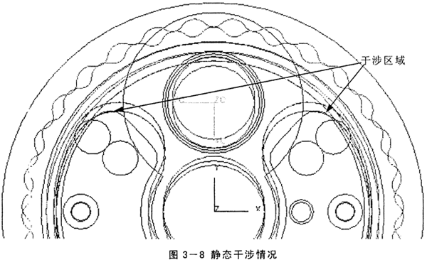 后三種都是實(shí)際結(jié)構(gòu)可能存在的,當(dāng)出現(xiàn)第一種干涉即硬干涉時(shí)就要引起高度重視,這可能是:設(shè)計(jì)存在問(wèn)題,必須及時(shí)糾正。就是借助此功能,造型完成后,本人發(fā)現(xiàn)輸出盤(pán)與擺紅、輪間有硬干涉(見(jiàn)圖3-8),與設(shè)計(jì)此減速器的部門(mén)交換意見(jiàn),原來(lái)他們?cè)谠O(shè)計(jì)完后沒(méi)有發(fā)現(xiàn)此問(wèn)題,等制造出成品后才發(fā)現(xiàn),便通過(guò)手工磨削將干涉部分除去。此處也充分體現(xiàn)了與傳統(tǒng)的設(shè)計(jì)方法相比,虛擬樣機(jī)技術(shù)有著不可比擬的優(yōu)越,即在制造第一臺(tái)物理樣機(jī)前就發(fā)現(xiàn)了機(jī)構(gòu)在結(jié)構(gòu)方面的缺陷。至于機(jī)構(gòu)的優(yōu)化和性能改進(jìn)方面,通過(guò)后面的仿真分析更能清楚地展現(xiàn)虛擬樣機(jī)技術(shù)的優(yōu)越。