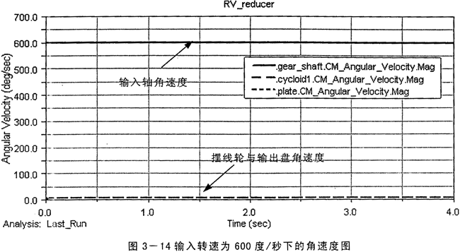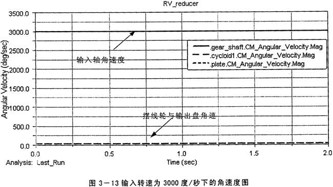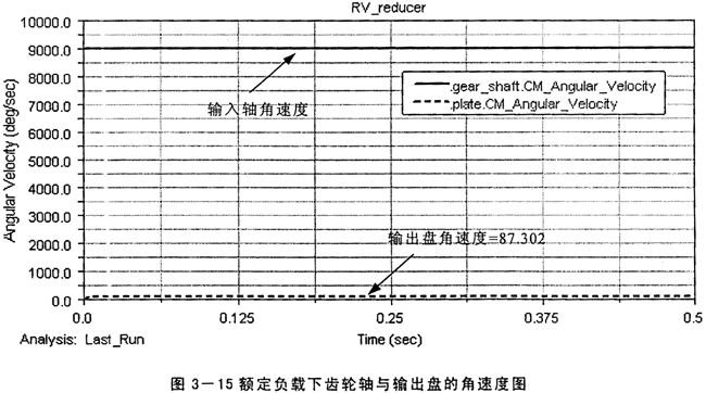 按RV減速器傳動(dòng)比的理論計(jì)算公式i16=1+(z2/z1)Z7,由村課題所研究的RV減速器的參數(shù):Z2=34,Z1=10,Z7=30,計(jì)算得到總的傳動(dòng)比為103,而由仿真得到的傳動(dòng)比在圖3-8中為i=3000/29.12=103.02,在圖3-9中為i=600/5.829=102.93,且圖中擺線輪與輸出盤(pán)的角速度相等說(shuō)明輸出部分施加的約束滿足等角速度輸出原理。