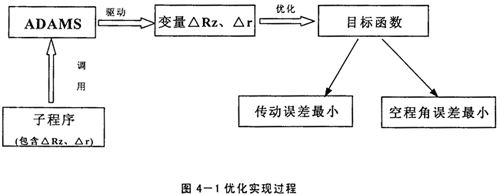 上已述及,擺線輪修形方式及修形量的選擇對RV減速器傳動誤差及空程角誤差的影響很大,因此進(jìn)行優(yōu)化分析應(yīng)將傳動誤差及空程角誤差作為目標(biāo)函數(shù),而將移距修形量△Rz及等距修形量△r作為設(shè)計變量,且△Rz與△r的正、負(fù)號表明了修形方式,子程序又是建立擺線輪的通用齒廓方程,通過ADAMS對子程序的調(diào)用,就可得到最優(yōu)的修形組合。具體的實現(xiàn)過程如下圖所示: