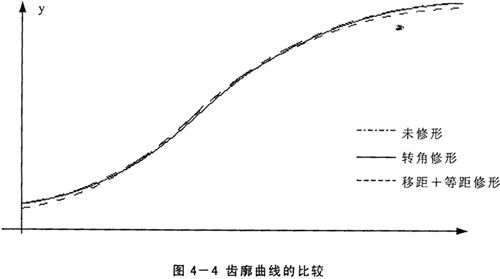 采用這種方法加工擺線輪時,磨齒機(jī)的調(diào)整和加工標(biāo)準(zhǔn)齒廓時相同,只是在磨出標(biāo)準(zhǔn)齒廓以后,將分齒機(jī)構(gòu)和偏心機(jī)構(gòu)的聯(lián)系脫開,然后撥動分齒掛輪上的齒輪,使工作臺轉(zhuǎn)過一微小的角度δ,從而改變了擺線輪在上一次磨削時的初始位置。這樣重新磨削后,就得到一條與標(biāo)準(zhǔn)齒廓基本上一樣的齒廓,僅整個輪齒變瘦一些,而齒間變大一些;其特點是同時嚙合齒數(shù)較多,但擺線輪的齒頂和齒根圓直徑?jīng)]有變化,該處與針齒相嚙合時沒有間隙存在,因此不能單獨使用轉(zhuǎn)角修形法。