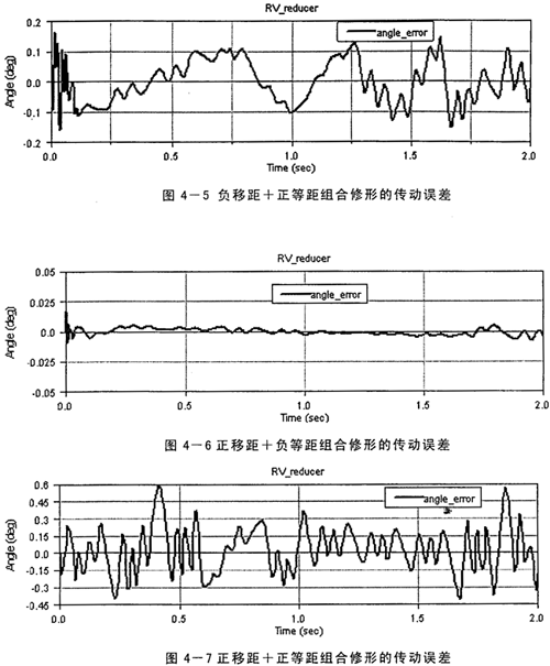 分析采用修形量及得到的空程角誤差值見表4-1,由表中的結(jié)果統(tǒng)計的得出正移距+負(fù)等距組合修形的誤差值要小于其它兩種組合修形的值,可以羅好地滿足設(shè)計要求。