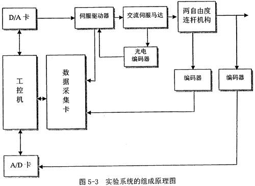 4.數據處理:(l)微機將電機位置信號作數值微分求得電機轉速。(2)微機用數字濾波程序將加速度信號作濾波、數值積分等處理。如圖5-3所示為實驗系統(tǒng)的組成原理圖: