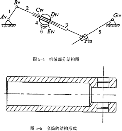 首先將原來的原理圖轉換成以下的機構結構圖(僅部分轉換),如圖5-4,即原來2、3構件之間是滑塊和連桿連接,現(xiàn)改為連桿、套筒改為加一個擺動軸結構,原來滑塊3和地面連接,容易形成過約束,改為加一個擺動軸承4來和地面、套筒來連接。擺動軸承內芯相當于一個球副,其轉動中心必為內芯的球心,當然也是整個擺動軸承的中心。這樣便于加工查和實驗實施,而且更重要的是可防止原來原理圖中桿件連接出形成過約束。