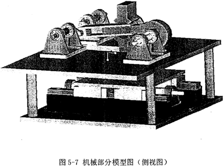 如圖5-1所示為實驗系統(tǒng)機械部分的模型圖片,為了顯示清楚,沒有配置外邊的機箱,整個機構是完全開放式的,這樣也便于實驗觀察。該機械結構由上下兩個機架支撐,和前面的原理圖不同,下邊機架上放置昆旋導軌構件(未顯示伺服電機),上邊機架則是上圖所示的其余連桿機構及其支撐架、軸承等(未顯示常速電機)。