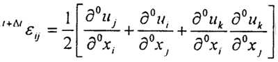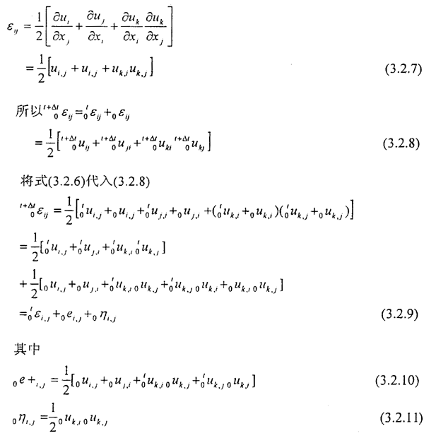 上式是將t+△t時刻的應(yīng)力、應(yīng)變、位移看成t時刻已知的應(yīng)力、應(yīng)變、位移和未知增量應(yīng)力{0S},應(yīng)變{0ε},位移{0u}之和,進一步,增量應(yīng)變{0ε}可用線性部分即{oε}={oe}+{oη}