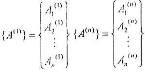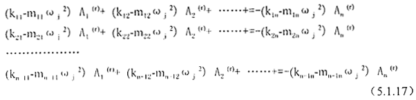 求得各階固有頻率ωni后,將方程5.1.6劃去其中不獨立的某一式,并將剩下的n-1個方程中的某一相同的Ai項(這里取最后一項),移到等式右邊,把某一ωnj2的值代入ω2后,得如下方程組: