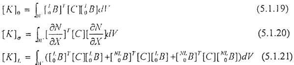 [K]0的求值并無困難,[K]σ稱初應(yīng)力或幾何剛度陣,它表示在大變形情況下初應(yīng)力對結(jié)構(gòu)剛度的影響,它未明顯含有位移增量,但Sij是Δq的函數(shù),因此[K]σ是變量Δq的隱函數(shù),對于[K]σ,當應(yīng)力為拉應(yīng)力時,結(jié)構(gòu)的剛度提高,當應(yīng)力為壓應(yīng)力時,結(jié)構(gòu)的剛度減小。[K]L稱為初位移剛度陣或大位移剛度陣,是由大位移引起的結(jié)構(gòu)剛度變化,是Δq的一階和二階函數(shù)。由公式5.1.19~5.1.21可見三個剛度都是對稱的,因而切向剛度陣[K]r也是對稱的。(以上考慮慣性力帶來的影響)。