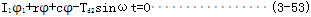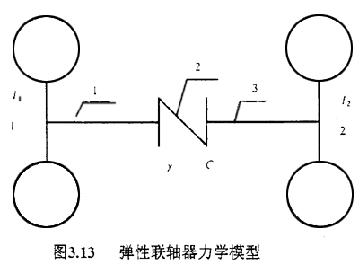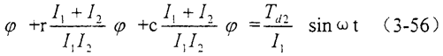 現(xiàn)單獨(dú)考慮擾動(dòng)轉(zhuǎn)矩產(chǎn)生的相對(duì)轉(zhuǎn)角φ2,目前國(guó)內(nèi)建立了圖3.13所示力學(xué)模型[2],出于橡膠件相對(duì)于兩側(cè)的鐵圈剛性很小,現(xiàn)假設(shè):(1)只有聯(lián)軸器兩側(cè)的鐵圈具有剛性,只有橡膠具有彈性和阻尼;(2)聯(lián)軸器主動(dòng)側(cè)作用有按簡(jiǎn)諧規(guī)律變化的擾動(dòng)轉(zhuǎn)矩分量Tdlsinωt此時(shí)按照動(dòng)量矩定理,按聯(lián)軸器兩側(cè)力矩平衡條件,可以分別列出兩個(gè)圓盤的轉(zhuǎn)動(dòng)運(yùn)動(dòng)方程式,即系統(tǒng)振動(dòng)的微分方程是: