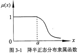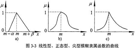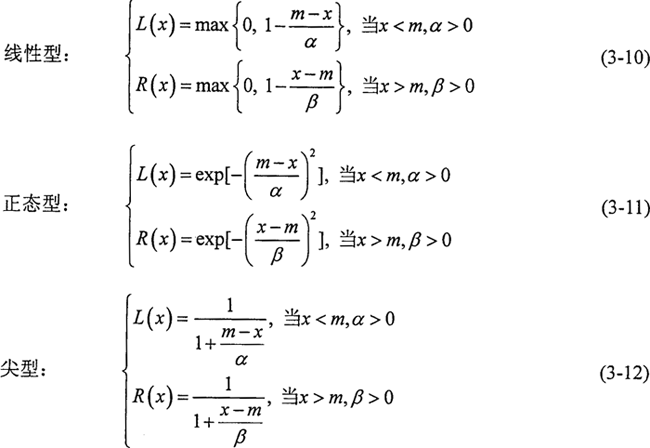 線性型參照函數(shù)在“完全屬于”和“完全不屬于”之間的中介狀態(tài)是線性變化的(圖3-3a),當x≤m-α和x≥m+β時,μ=0,說明在(m-α,m+β)區(qū)間之外的數(shù)值完全不屬于該模數(shù)數(shù)。而其他兩種類型的隸屬函數(shù)曲線兩端延伸至無窮遠(圖3-3b,c)說明整個數(shù)軸上的任何數(shù)總在一定程度上隸屬于該模糊數(shù)。在選擇參照函數(shù)時,除非有絕對的把握認為該事件發(fā)生的概率在某個范圍之內而選擇線性參照函數(shù),否則,以選取正態(tài)型或尖型為好。
