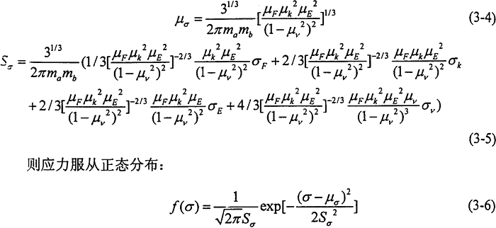 將F、∑k視為隨機變量,并近似按“3σ”法求出其均值μF、μk與標準差SF、Sk,根據文獻,彈性模量E、泊松比v均為隨機變量,且近似服從正態(tài)分布,彈性模量的變異系數(shù)對鋼而言不超過0.03,即彈性模量的標準差為6180MMPa,而泊松比的變異系數(shù)一般在2%-3%左右,則泊松比的標準差為0.009。按可靠度計算的一次二階矩原理,將齒面接觸應力的表達式在基本變量的平均值點處展開成泰勒級數(shù),僅取級數(shù)的線性項,則可近似求得應力的均值μa與標準差Sσ分別為: