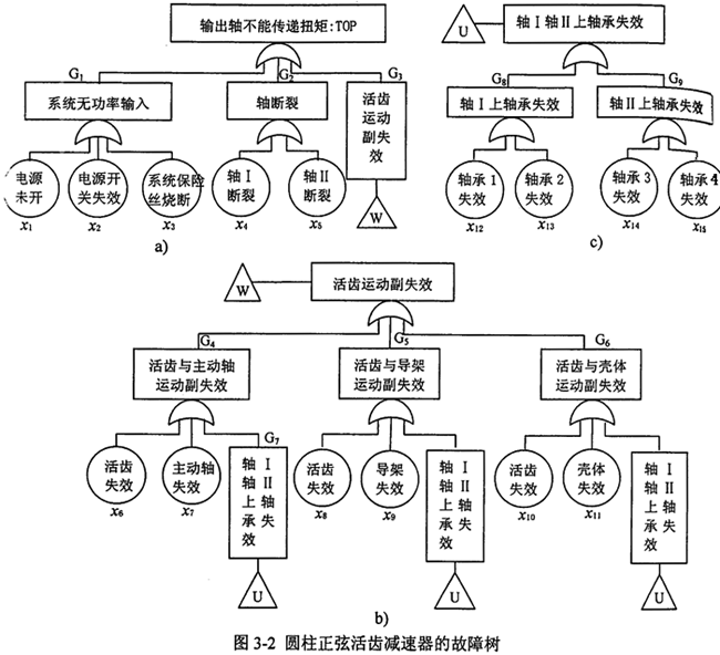 在系統(tǒng)可靠性研究方法中,故障樹分析(FTA)是一種用于復雜系統(tǒng)可靠性和安全性分析的有效方法,F(xiàn)TA是一種圖形演繹方法,能通過對可能造成系統(tǒng)故障的多種因素(包括軟件、硬件、環(huán)境、人為因素)進行分析,畫出邏輯框圖即故障樹,從而確定系統(tǒng)故障原因的各種可能組合方式或其發(fā)生概率。本章在分析圓柱正弦活齒減速器系統(tǒng)結構及功能關系的基礎上,建立圓柱正弦活齒減速器的故障樹,確定了系統(tǒng)的最小割集。將模糊數(shù)學引入傳統(tǒng)的故障樹分析中,根據建立的故障樹中各事件的邏輯關系,采用模糊數(shù)的運算法則及模糊算子AND和OR計算出系統(tǒng)以“輸出軸不傳遞扭矩”為故障的模糊概率值。