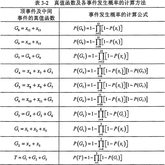 故障樹的定量分析是運用故障樹中建立的邏輯關系,根據底事件發(fā)生的概率推導出頂事件發(fā)生的概率,從而對系統(tǒng)的可靠性、安全性作出評價。故障樹中各種事件間的因果關系用各種“門”來描述,并且大多可以等效為邏輯“與門”和“或門”。根據“與門”和“或門”所表示的事件關系,并假設各個事件互相獨立,根據表3-2即可計算活齒減速器中各中間事件和頂事件的發(fā)生概率。