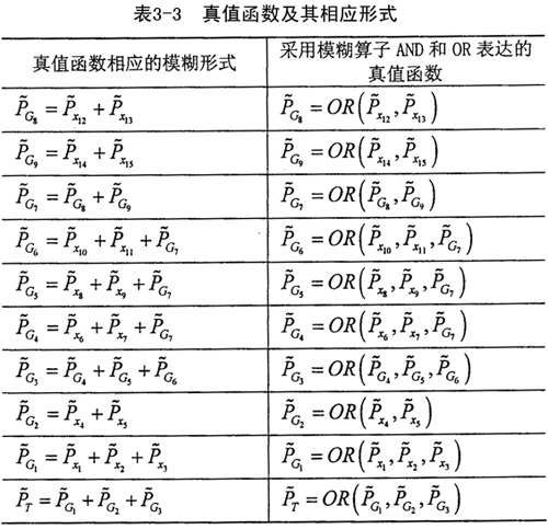 3.3.3.3圓柱正弦活齒減速器故障樹分析 根據圓柱正弦活齒減速器故障樹,用模糊算子ACD和OR描述基本事件間的邏輯關系,生成值值函數(shù)的模糊形式及用模糊算子表達的形式見表3-3。
