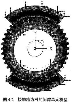 重慶大學(xué)機(jī)械傳動(dòng)國(guó)家重點(diǎn)實(shí)驗(yàn)室對(duì)三環(huán)減速器的內(nèi)齒環(huán)板所做的應(yīng)力分析以及對(duì)少齒差內(nèi)嚙合齒輪輪齒接觸問(wèn)題研究均表明,三環(huán)減速器是多齒嚙合的。根據(jù)有關(guān)理論,筆者所在的課題組對(duì)完全平衡三環(huán)減速器的輪齒應(yīng)力和多齒嚙合問(wèn)題進(jìn)行了理論計(jì)算和實(shí)驗(yàn)研究,結(jié)果表明,三環(huán)傳動(dòng)由于嚙合過(guò)程中的輪齒受力變形形成了多齒接觸,各齒上的載荷分布近似0°~180°間的正弦關(guān)系。圖4-2所示是接觸輪齒對(duì)的間隙單元模型。