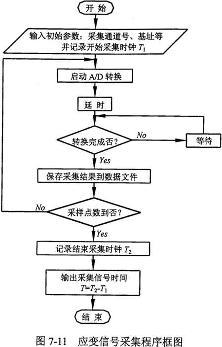 對應于所選用的A/D轉(zhuǎn)換板,編制的應變信號采集程序框圖如圖7-11所示。