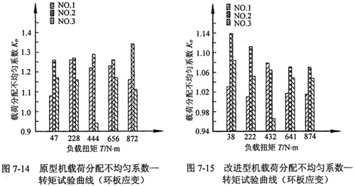 對(duì)兩級(jí)三環(huán)減速器的原型機(jī)和改進(jìn)型機(jī)的環(huán)板齒根彎曲應(yīng)力和環(huán)板薄弱部位的應(yīng)力進(jìn)行了測(cè)試,并討論了載荷均衡情況。結(jié)果表明:改進(jìn)型機(jī)具有很好的均載效果,載荷分配不均勻系數(shù)由均載前的1.33降為均載后的1.07。這個(gè)數(shù)值較基本型三環(huán)減速器的載荷分配不均勻系數(shù)1.7小的多。