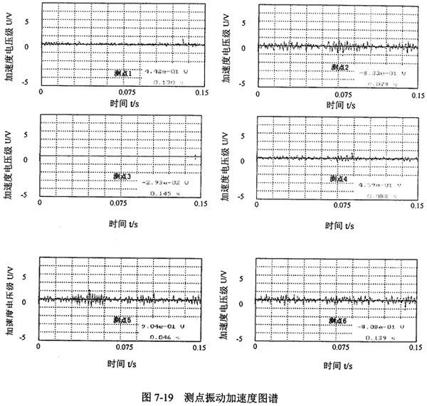 圖7-19所示是一組輸出轉(zhuǎn)矩為875N.m,轉(zhuǎn)速為1080r/min工況時(shí)的實(shí)測(cè)振動(dòng)加速度結(jié)果,加速度最大值及對(duì)應(yīng)的時(shí)間標(biāo)記在圖上。(1×e-1v代表1m/s2)