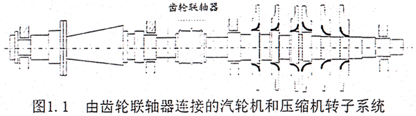 以往在對軸承一轉(zhuǎn)子系統(tǒng)進行動力學(xué)分析的過程中,對于構(gòu)成系統(tǒng)的一些典型部件,如轉(zhuǎn)子、支承軸承、密封以及基礎(chǔ)都作過較深入的研究,但對于聯(lián)軸器耦合效應(yīng)的討論卻不多。直觀地講,多跨轉(zhuǎn)子正是依賴多個聯(lián)軸器才得以構(gòu)成大型系統(tǒng)的,因此更確切地講對于大型的多跨(或分跨)轉(zhuǎn)子系統(tǒng)可以稱為軸承—轉(zhuǎn)子—聯(lián)軸器系統(tǒng)。以大型的汽輪發(fā)電機組和壓縮機組為例,汽輪發(fā)電機組在低壓轉(zhuǎn)子、發(fā)電機轉(zhuǎn)子以及勵磁機轉(zhuǎn)子間均采用了剛性或半撓性聯(lián)軸器結(jié)構(gòu);對于壓縮機組,在壓縮機轉(zhuǎn)子和驅(qū)動設(shè)備如驅(qū)動汽輪機轉(zhuǎn)子或電機轉(zhuǎn)子之間也要采用不同形式的聯(lián)軸器。圖1.1所示是一透平壓縮機組的簡圖,為一典型的軸承—轉(zhuǎn)子—齒輪聯(lián)軸器系統(tǒng),整體系統(tǒng)由一個CL型的齒輪聯(lián)軸器將汽輪機轉(zhuǎn)了和壓縮機主軸連接組成。
