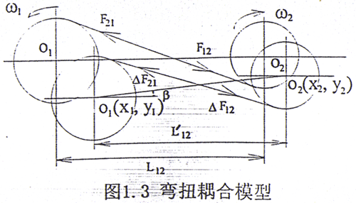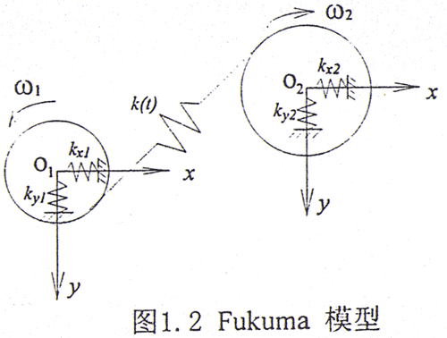 齒輪是機械系統(tǒng)中一個非常重要的部件,主要用于傳遞轉(zhuǎn)子之間的運動。對于外齒輪耦合轉(zhuǎn)子軸承系統(tǒng)的研究已經(jīng)進行了數(shù)十年[14],比較典型的模型有Fukuma[15]、IWATSUBO[16]、Kahraman[17]模型和彎扭耦合模型[18],其中[15,18]中的模型分別如圖1.2和圖1.3所示。這些模型的共同特點是將嚙合的輪齒看成能夠產(chǎn)生變形的彈簧,同時考慮了齒輪中心的橫向位移和繞中心轉(zhuǎn)動的扭轉(zhuǎn)角位移,這樣對一個外齒輪而方Fukuma[15]模型就具有三個自由度,一對嚙合的外齒輪共有六個自由度;而彎扭耦合模型[18]則考慮了齒輪之間的嚙合關(guān)系,這一關(guān)系相當(dāng)與給系統(tǒng)增加了一個約束,使得系統(tǒng)的自由度減少了一個,因此是一個五自由度模型。