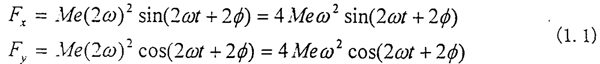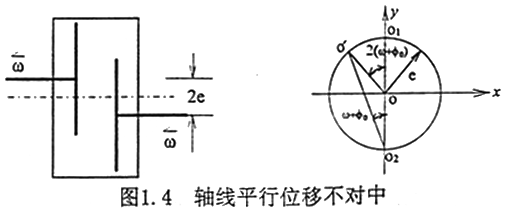 不對中具有一些典型的特征,如不對中比較嚴重時會使軸承的油膜壓力偏離正常值,聯(lián)軸器不對中時聯(lián)軸器兩端軸承的振動較大,軸心位置不穩(wěn)定,而且在振動頻譜中二倍頻分量幅值較大等。而對于齒輪聯(lián)軸器不對中產(chǎn)生倍頻振動分量的機理研究又是其中的一個重點。文獻[68]指出,由于安裝時轉(zhuǎn)子軸心線不對中引起的振動,在用電機驅(qū)動的轉(zhuǎn)子系統(tǒng)中,當(dāng)電機軸與負載機械由齒輪聯(lián)軸器連接時,電機軸存在二倍頻的振動,而在單獨運動時,倍頻振動立即消失,這表明倍頻振動完全是齒輪聯(lián)軸器耦合的結(jié)果。文獻[64,65]解釋了由于齒輪聯(lián)軸器不對勁中而產(chǎn)生二倍頻振動的機理,以[65]中的軸線平行位移不對中為例見圖1.4,圖中ω為轉(zhuǎn)子的轉(zhuǎn)動的解速度,2e為不對中量,M為內(nèi)齒套的質(zhì)量,φ0為起始回轉(zhuǎn)角。