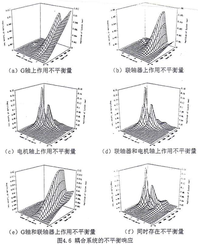 (3)分別在齒輪聯(lián)軸器和電機(jī)軸、G軸和齒輪聯(lián)軸器以及三處同時存在不平衡量,并設(shè)由此產(chǎn)生不平衡力的作用方向相同,計算了耦合系統(tǒng)的不平衡響應(yīng)。計算結(jié)果見圖4.6d~4.6f。