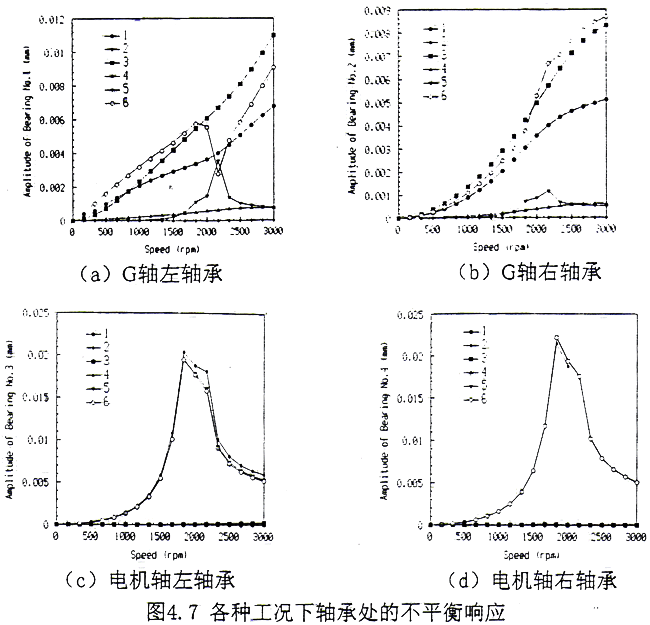 比較圖4.5a和4.6a可見,同樣在G軸的大齒輪上存在不平衡量,單軸和耦合系統(tǒng)所產(chǎn)生的響應(yīng)卻有較大的差別。用單個G軸計算,從G軸的左端開始到右軸承不平衡響應(yīng)幅值變化比較平緩,隨后迅速增大,在外伸端達(dá)到最大值;而用耦合系統(tǒng)來計算,則在G軸的左端振幅最大,比用單個G軸計算所得值在同一位置高得多,隨后迅速減小,在G軸的右軸承處振幅最小,之后又迅速增大,在外伸端達(dá)到一極值,但比用單個G軸所得值小,這一特點(diǎn)表明,耦合后G軸外伸端的不平衡響應(yīng)受到一定程度的抑制;從圖4.6b可知,聯(lián)軸器的不平衡量對本身的振動產(chǎn)生較大的影響,對G軸左右軸承的影響較小,當(dāng)然這與聯(lián)軸器的不平衡量密切相關(guān),如果聯(lián)軸器的不平衡量較大,則另當(dāng)別論;由圖4.6f可見,在G軸、聯(lián)軸器和電機(jī)軸上同時存在不平衡量時,在工作轉(zhuǎn)速下,聯(lián)軸器處的響應(yīng)幅值很大,與圖4.6b相比可知,聯(lián)軸器處的振動是G軸、聯(lián)軸器本身和電機(jī)軸三處不平衡力綜合作用的反應(yīng),聯(lián)軸器處振動過大對其可靠運(yùn)行帶來不利。另外比較圖4.5和圖4.6可知,電機(jī)軸的不平衡響應(yīng)主要是由電機(jī)軸自身的不平衡造成的,G軸和聯(lián)軸器的不平衡對其影響很小。從圖4.7可見,僅在G軸上作用不平衡力,當(dāng)轉(zhuǎn)速超過1000(rpm)后,用耦合系統(tǒng)計算所得G軸軸承上的振幅明顯大于用單個G軸所得值,而且隨轉(zhuǎn)速增大,變化越明顯。在工作轉(zhuǎn)速下,二軸承處的振幅前者分別是后者的1.60倍和1.66倍,這表明用單個G軸計算G軸二側(cè)軸承的不平衡響應(yīng)是不安全的,而且實(shí)際測量[18]的結(jié)果確實(shí)要比計算所得的值要大得多。另外,在軸承處的不平衡響應(yīng),只要是用耦合系統(tǒng)進(jìn)行計算,那么在非共振區(qū)各轉(zhuǎn)子的不平衡只對本身所所在二個軸承的振幅起決定作用,而對另二個軸承影響不大。這反映了在一般情況下,一側(cè)轉(zhuǎn)子的不平衡所引起的振動通過聯(lián)軸器而傳遞到另一側(cè)的振動較小,這也正是齒輪聯(lián)軸器被廣泛采用的另一個優(yōu)點(diǎn)。
